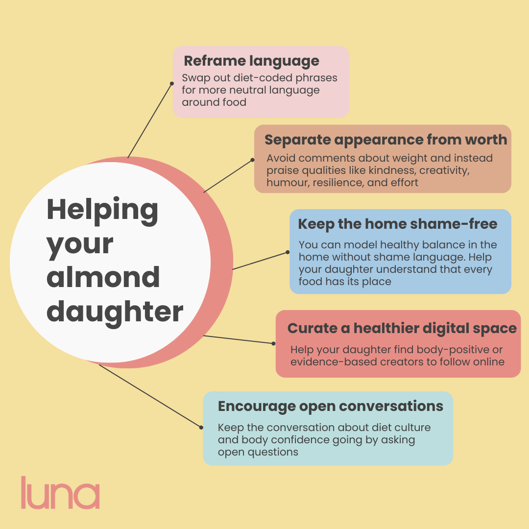 - An almond daughter is a teen influenced by diet culture, food rules, and body-image pressure, often unconsciously internalised from family