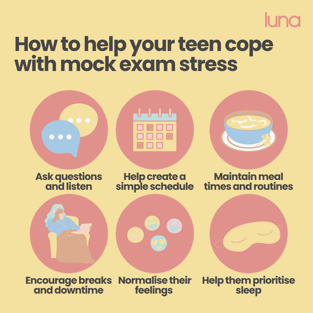 1 in 7 teens told luna that having a calm and supportive home environment reduced their stress significantly – so even simple gestures like making a favourite snack or cup of tea while they revise, or taking a short walk together, can help reset the atmosphere.