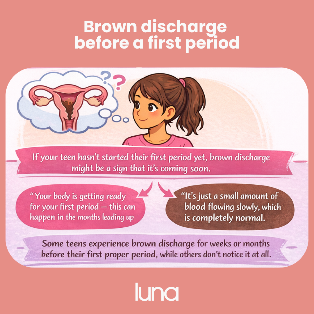 If your teen hasn’t started their first period yet, brown discharge might be a sign that it’s coming soon.