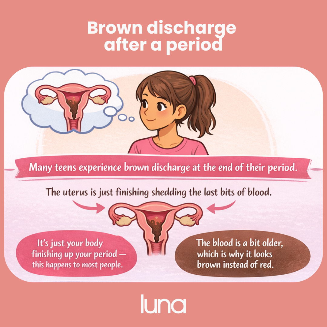 If brown discharge lasts more than a few days after their period ends, it could be due to hormonal fluctuations, which are very common in teens as their cycles start to regulate.