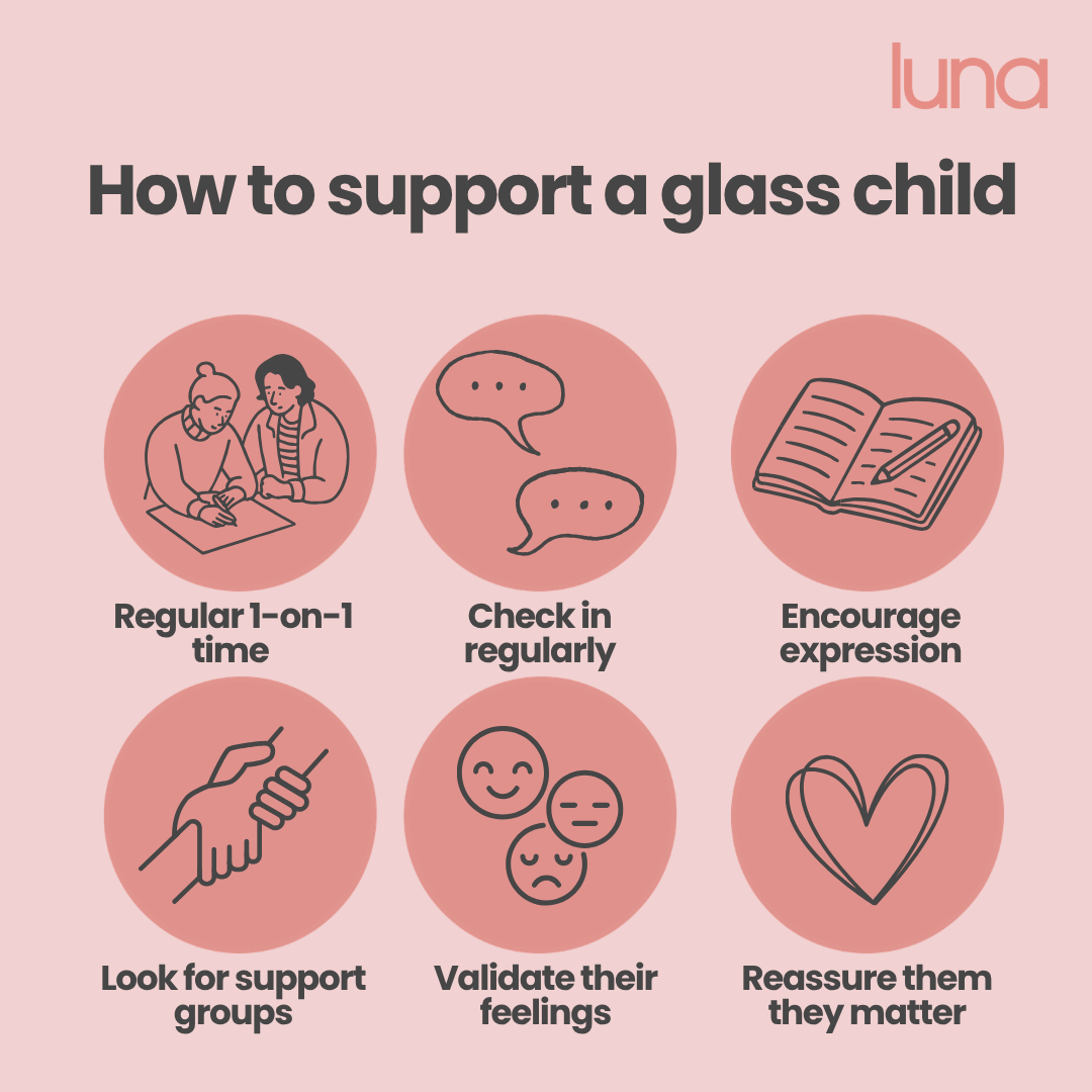 It can help to keep in mind that you’re not failing and you are doing your best. Navigating this family dynamic can be overwhelming and complex, but a little goes a long way. Keep checking in with your glass child, prioritising one-to-one time, and talking about mental health with them.