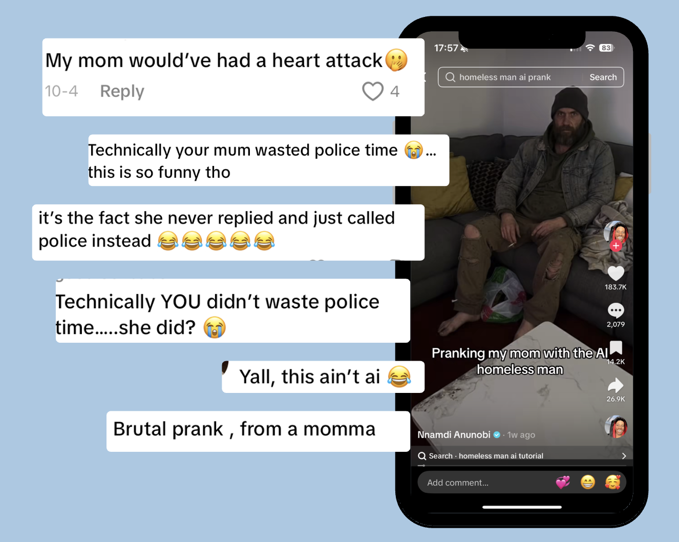 The prank works like this: teens use AI image generators to make a very real-looking photo of a “homeless man” sitting in their kitchen, lying on the sofa, or even sleeping in their room.